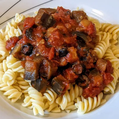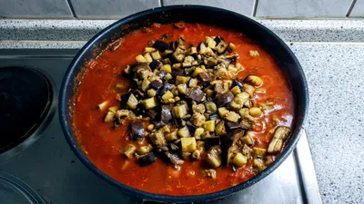 6.Die Auberginen dazugeben, und nochmal erwärmen.